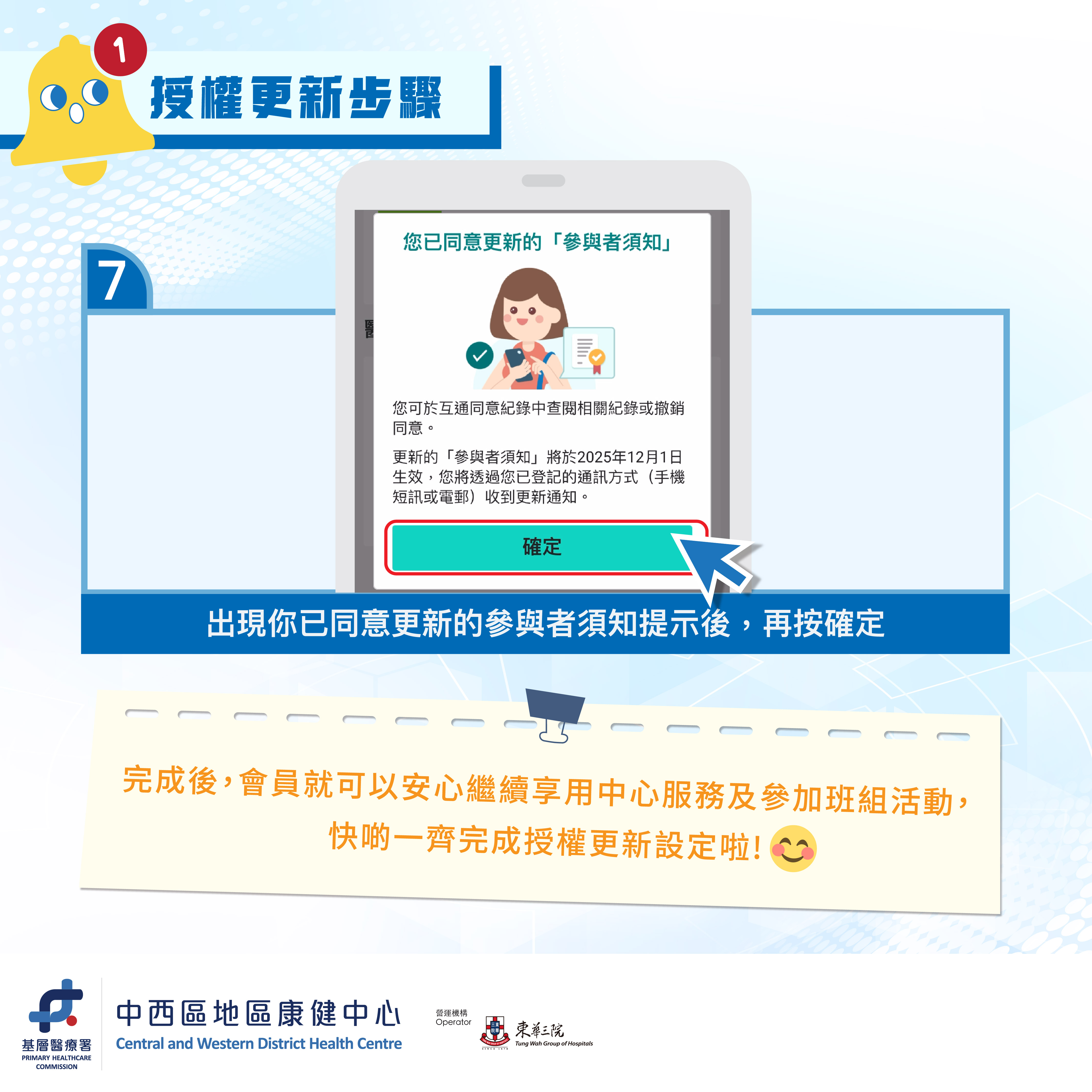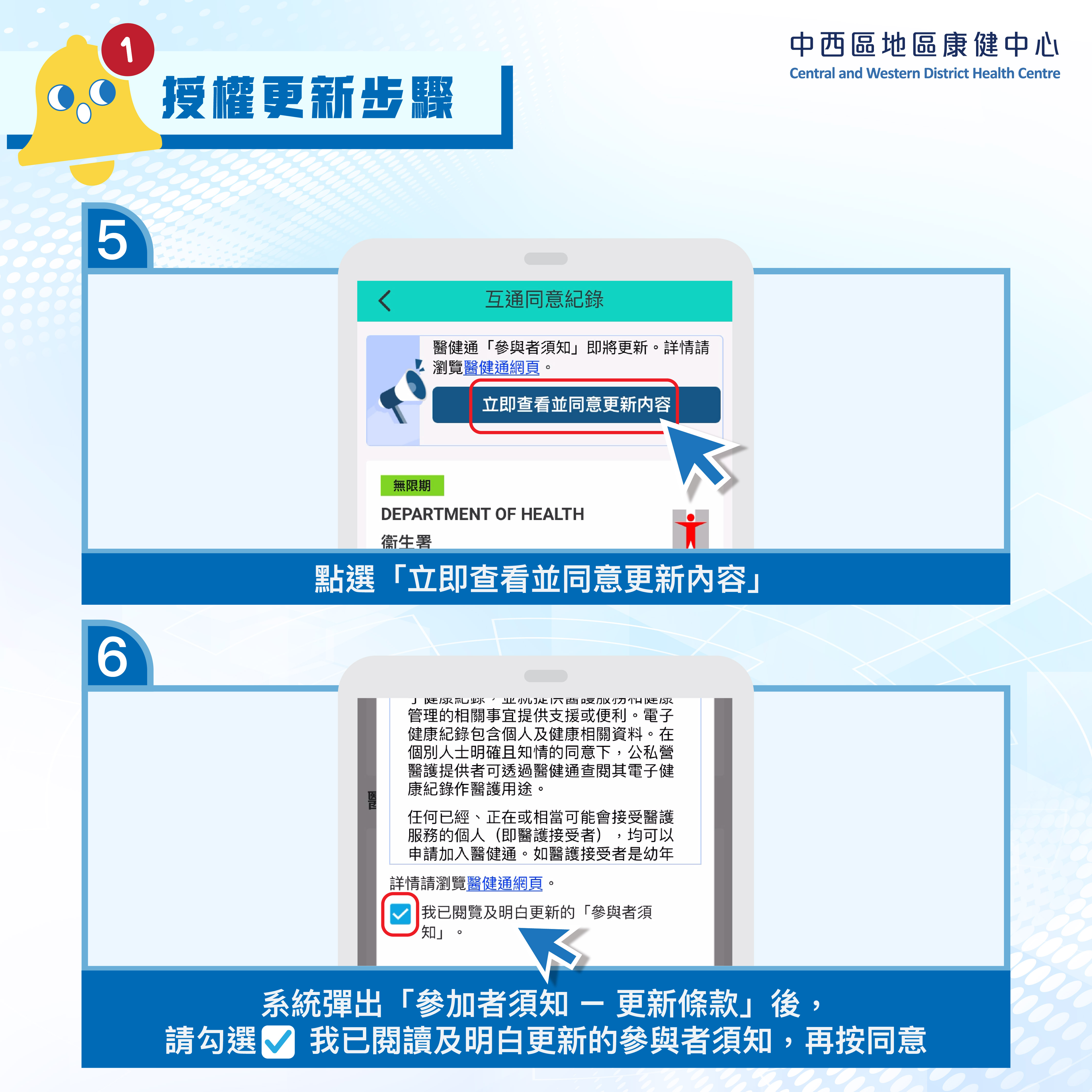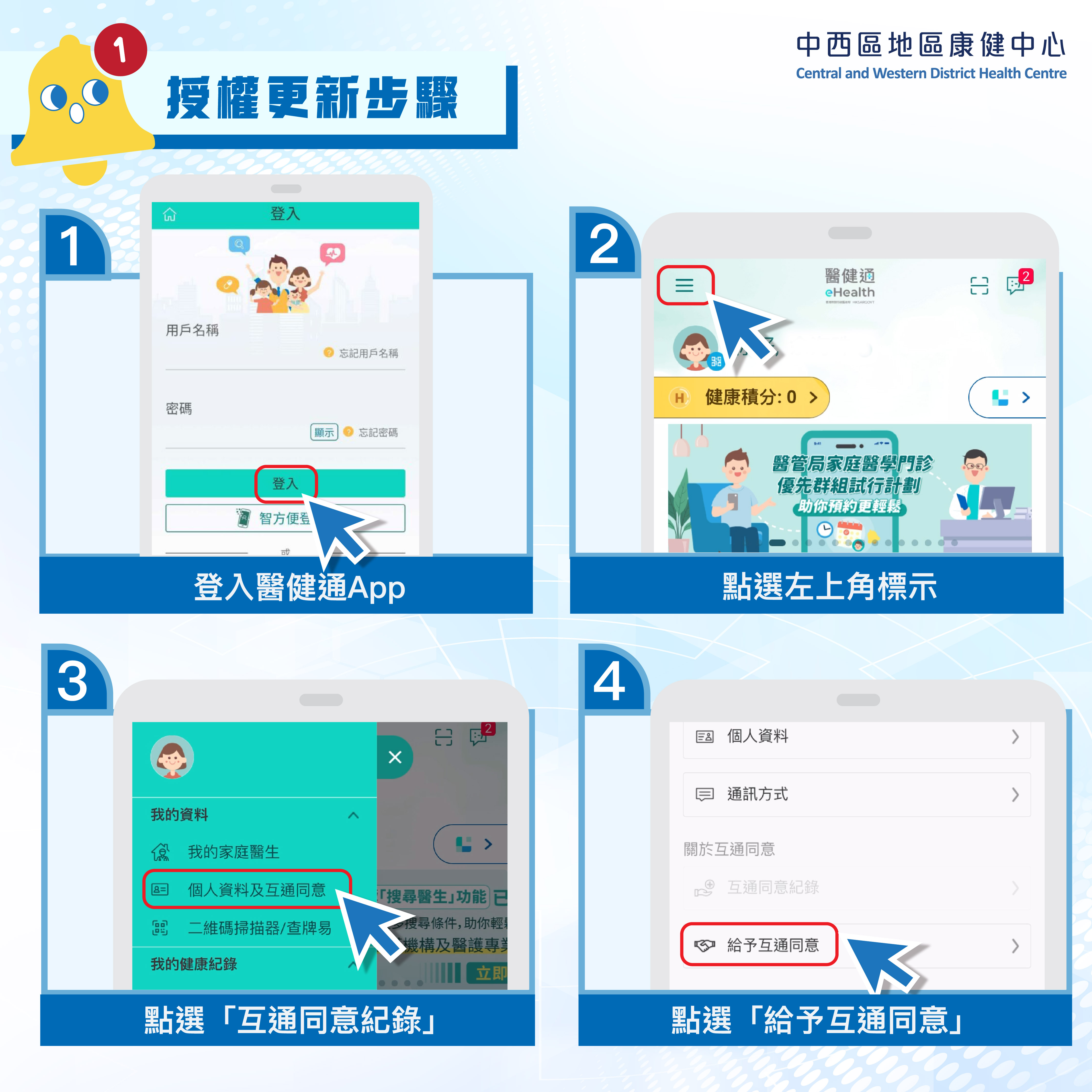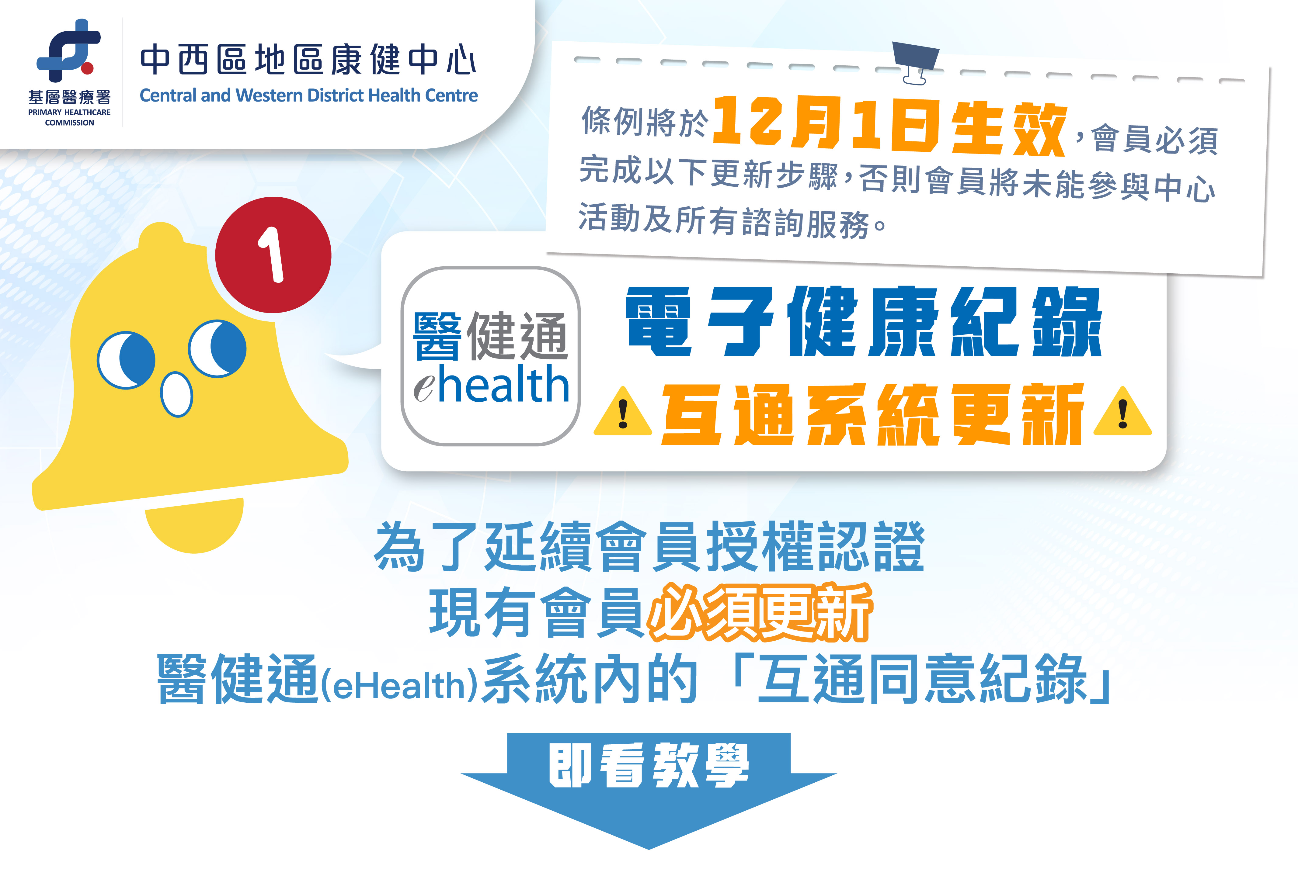 🚨中西區地區康健中心嘅會員注意啦!🚨為確保各位會員可以無縫繼續享用中心服務,現有會員請盡快完成醫健通App內「互通同意紀錄」更新設定。