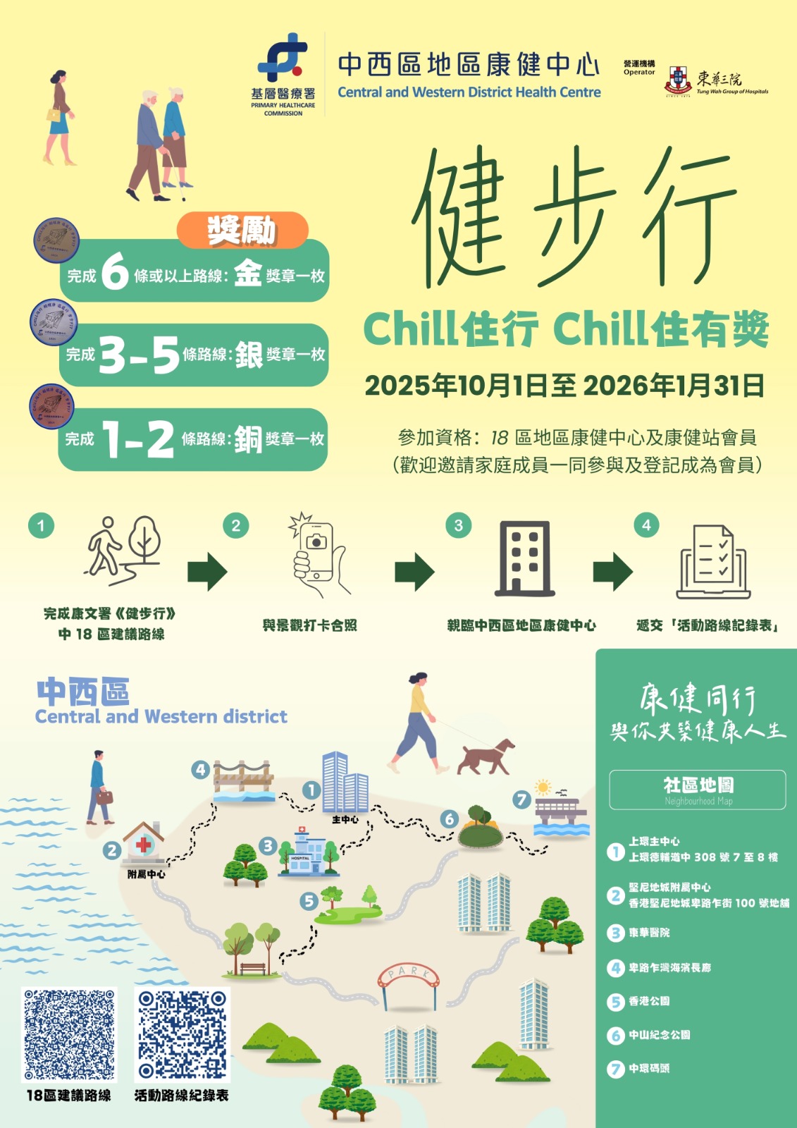 😆你無睇錯呀!依家只要完成康文署《健步行》內全港18區嘅任何一條指定路線,就可以獲得特別設計嘅精美獎章🏅!適量嘅行路運動對身體嘅好處多多💪🏻,歡迎所有嘅中西區地區康健中心會員一齊參與,等我地一齊Chill 住行,Chill住有獎🤗!