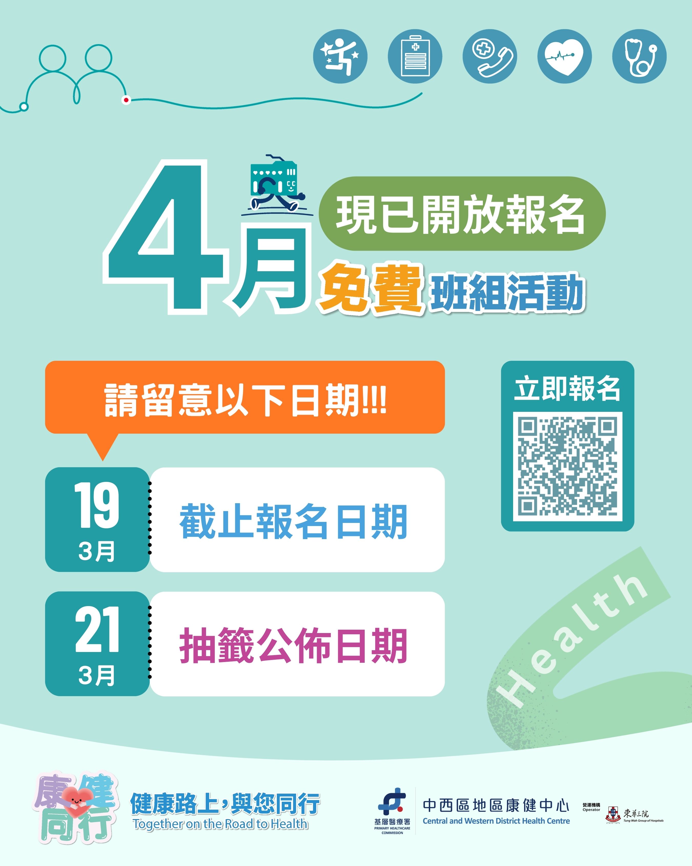 親愛的會員們,四月份班組報名現已開放!不論你是想提升健康知識,還是想學習實用的運動技巧,都歡迎各位參加中西區地區康健中心的免費班組活動,一起在健康的道路上向前邁進!