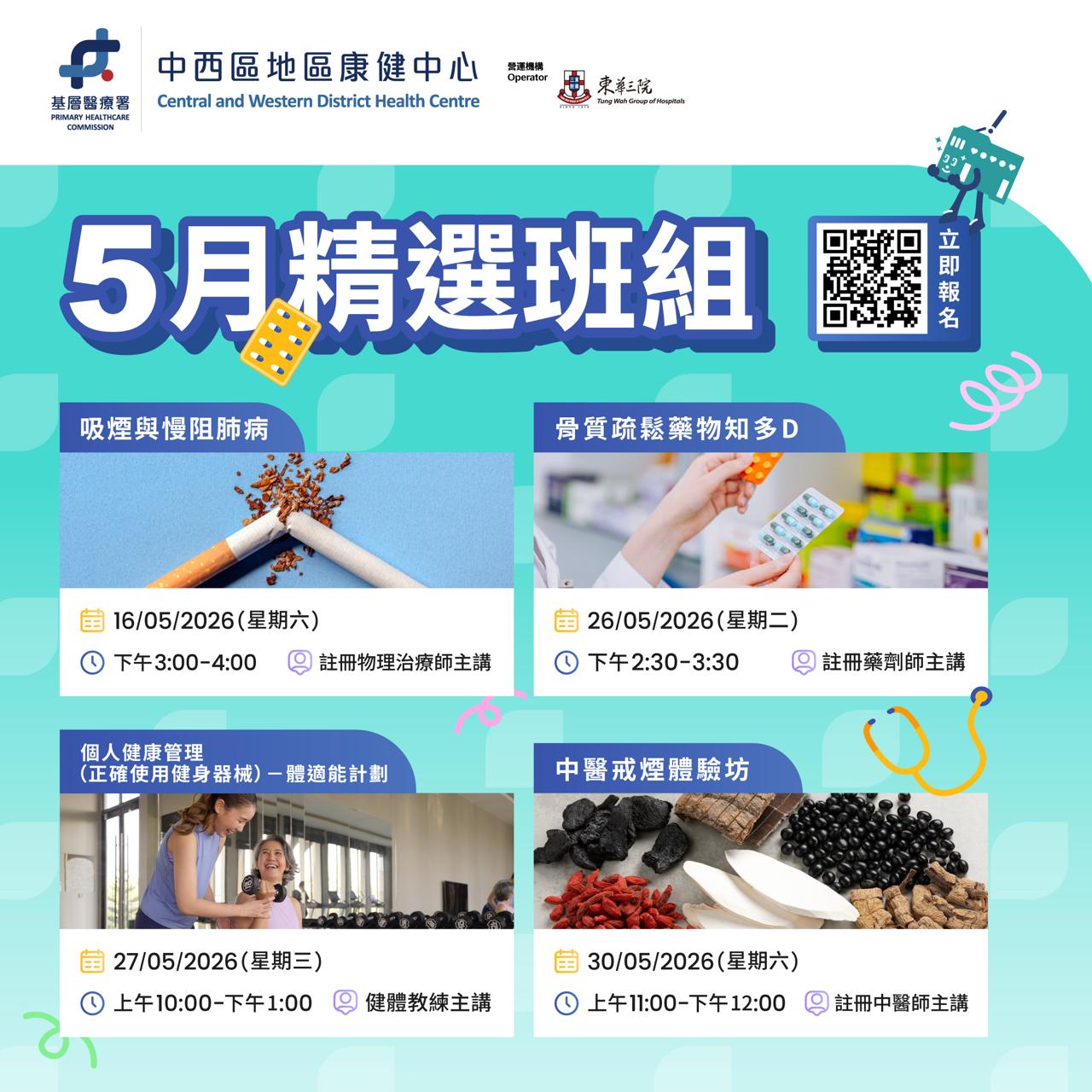 中西區地區康健中心5月班組現已接受報名,本月課程涵蓋肺部健康、骨質疏鬆用藥知識、體適能器械訓練及中醫戒煙體驗,由物理治療師、藥劑師及健體教練主講,助你由內到外全面守護健康!✨