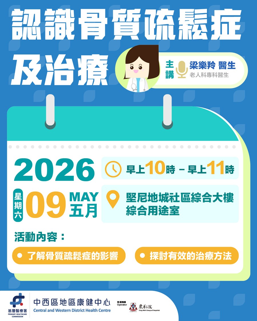 為了讓長者及其照顧者能及早認識這一疾病,中西區地區康健中心聯同香港老人科醫學會特別舉辦了「骨質疏鬆症健康教育講座」。在這場講座中,參加者將學習到肌肉力量及耐力的訓練方法,從而降低跌倒和受傷的風險,幫助您保持健康,活得更加精彩!