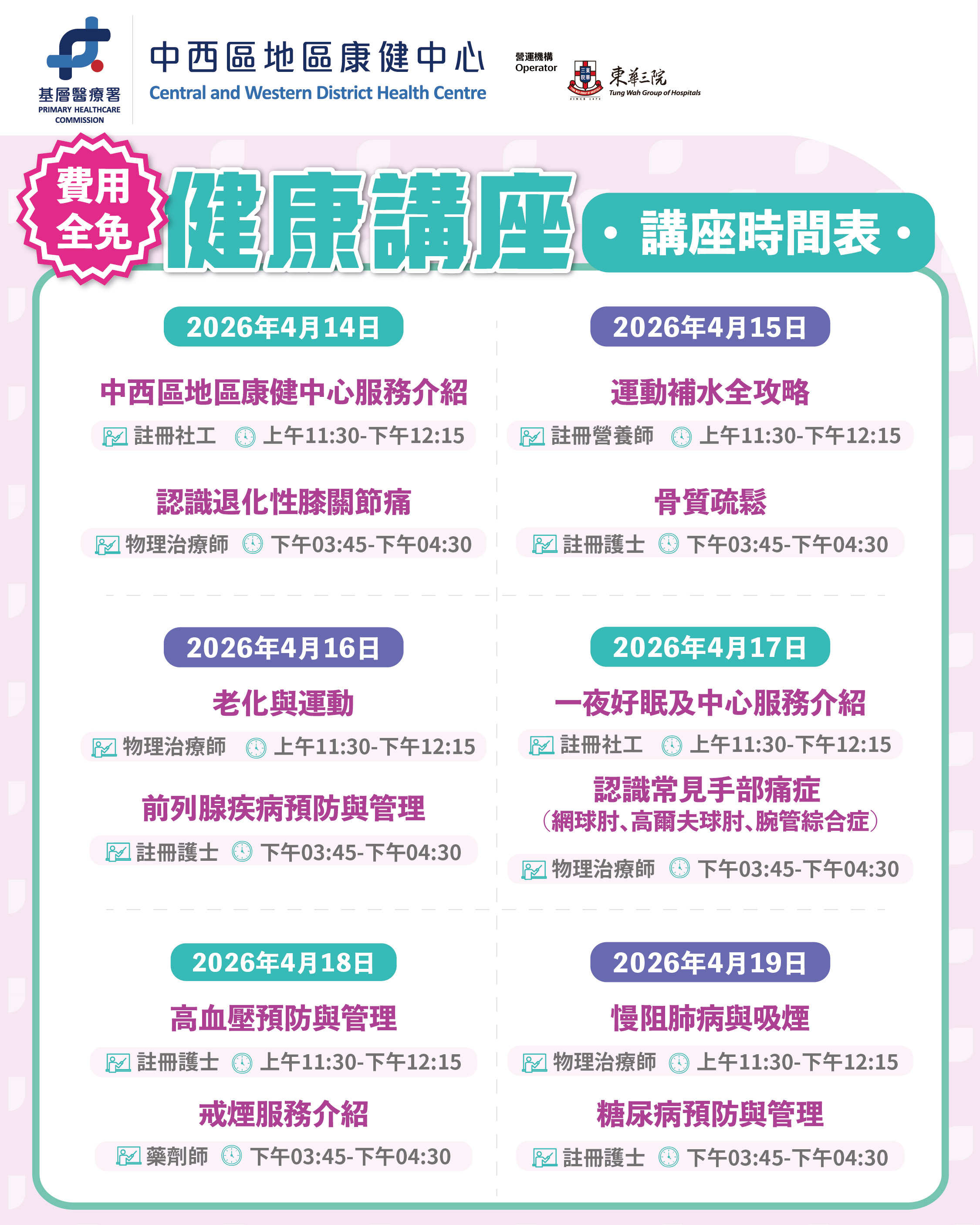 • 中西區地區康健中心服務介紹(11:30-12:15)