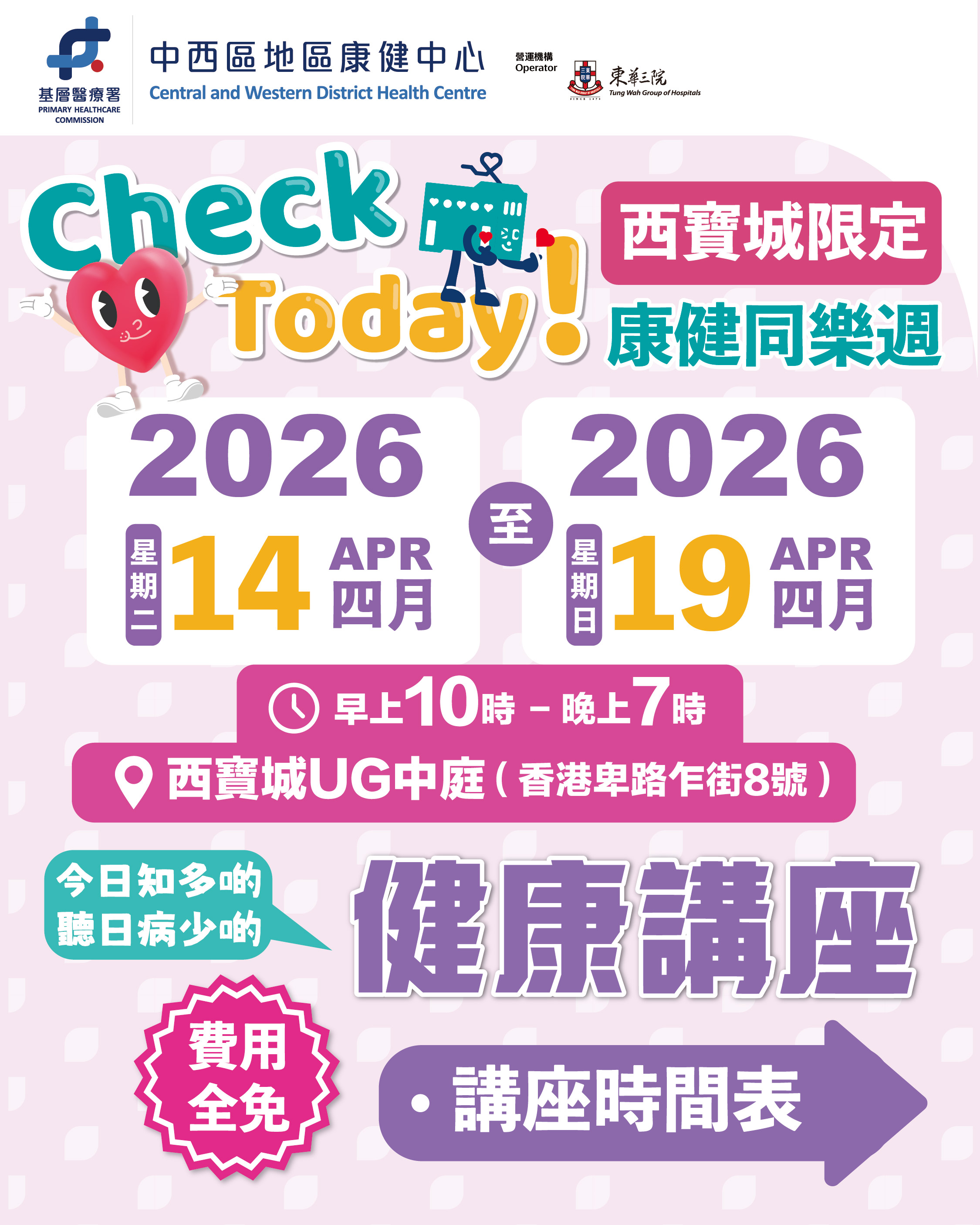 中西區地區康健中心同大家係西寶城一齊開心過康健同樂週!歡迎中西區既街坊以及想學習更多健康知識既市民,於以下時段到西寶城UG中庭一齊聽健康講座!